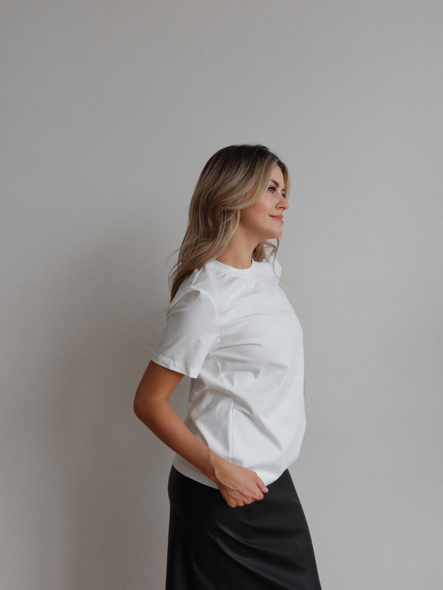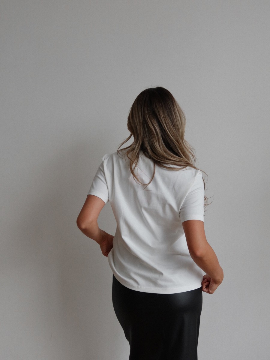 Футболка спокойно подружится и с романтичной юбкой, и с простыми джинсами или брюками из экокожи. Модель с округлым вырезом. Материал легкий, на основе хлопка, пропускает воздух, не сковывает движения, поэтому в такой вещи будет комфортно в течение всего дня.