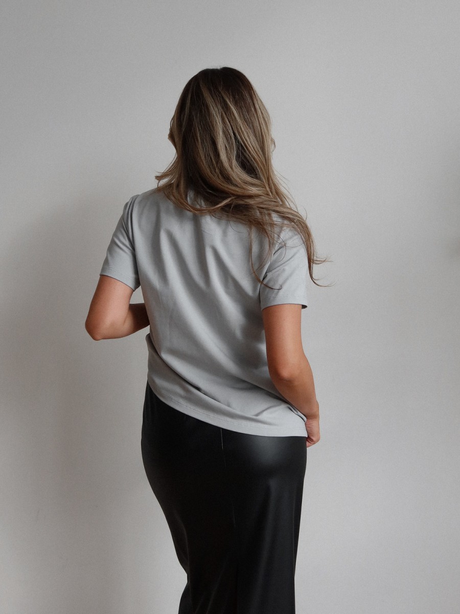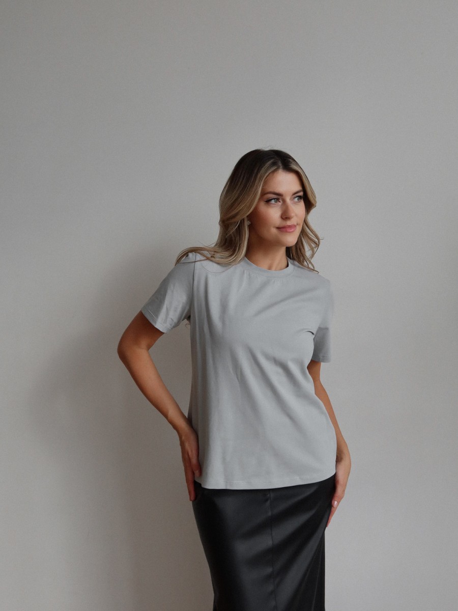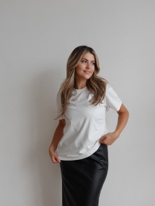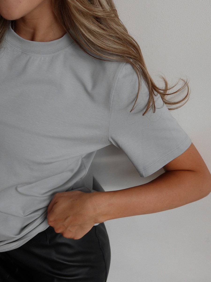 Футболка спокойно подружится и с романтичной юбкой, и с простыми джинсами или брюками. Модель с округлым вырезом. Материал легкий, на основе хлопка, пропускает воздух, не сковывает движения, поэтому в такой вещи будет комфортно в течение всего дня.