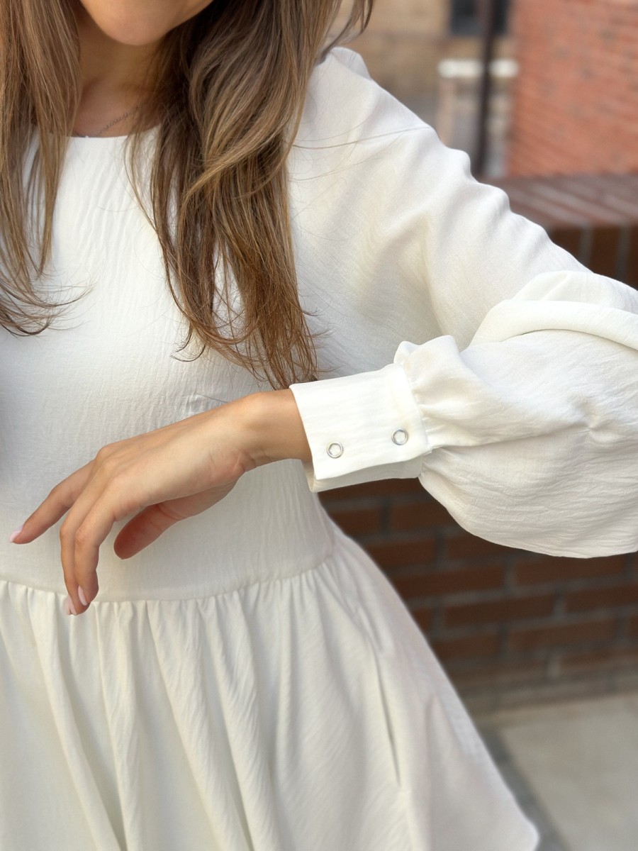 свободный, с манжетой, застегивающейся на кнопки. По окату и линии притачивания